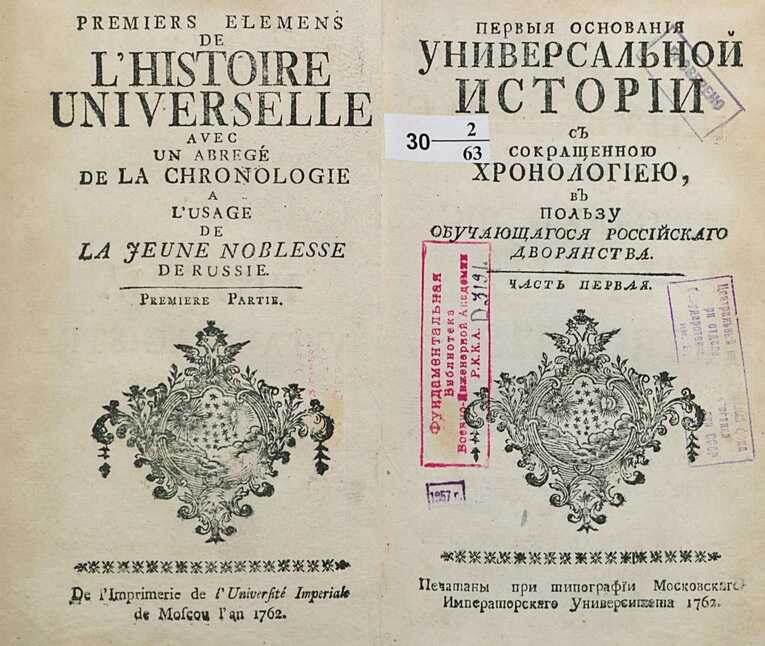 «Первые основания универсальной истории с сокращённою хронологией в пользу обучающегося российского дворянства».Этот труд, написанный Филиппом Генрихом Дильтейем (Philipp Heinrich Dilthey), был предназначен исключительно для российского дворянства — будущей элиты империи. Он издавался на русском и французском языках, что было обычной практикой в аристократических кругах, но содержание книги — ничем не напоминало современные учебники.