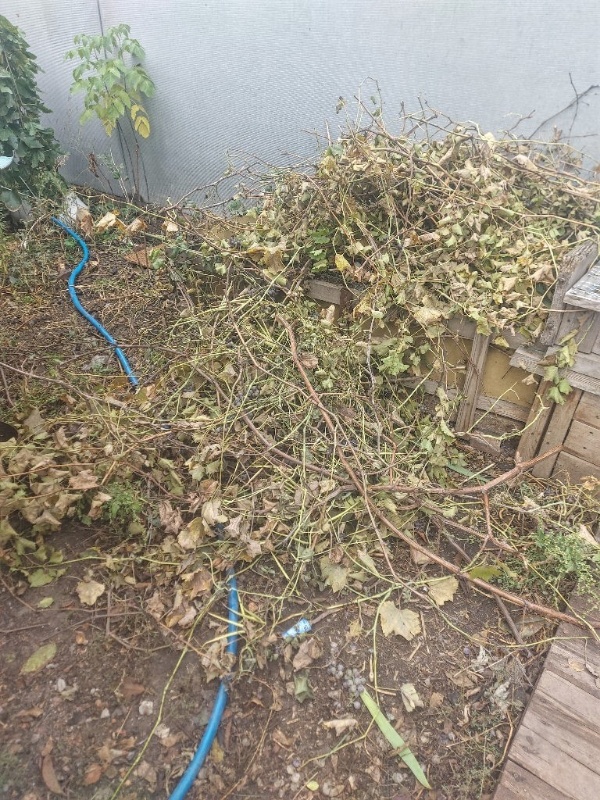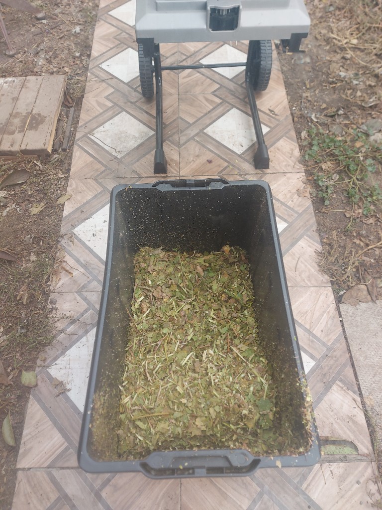 Сегодня, из относительно небольшой кучи обрезков винограда, получилось 25 литров мульчи. Но виноград малость задолбисто засовывать в приёмное отверстие. Приходится обрезать лишние веточки секатором.